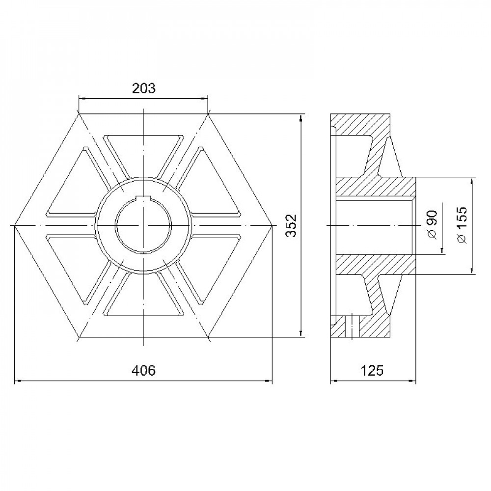 Ступица ДО-1М-297.01.02.001 с посадочным диаметром 90 мм устанавливается в дробилку ДО-1М в количестве двух штук. К ступице крепятся дробящие сегменты А и Б.